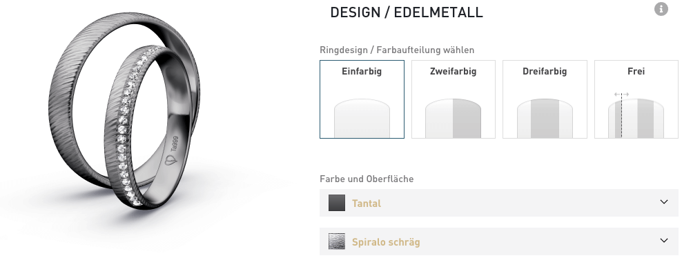 War es lange Zeit überhaupt noch nicht möglich individuelle Gestaltungswünsche in Tantalringe einfließen zu lassen, so verfügen wir mittlerweile über unzählige Möglichkeiten auch diese besonderen Ringe für unsere Kunden nach persönlichen Vorgaben zu designen. Unser Trauring Konfigurator bietet Ihnen ab sofort die Möglichkeit Ihre Ringe in dem Material Tantal zu konfigurieren. Besuchen Sie unseren Konfigurator und probieren Sie es aus.